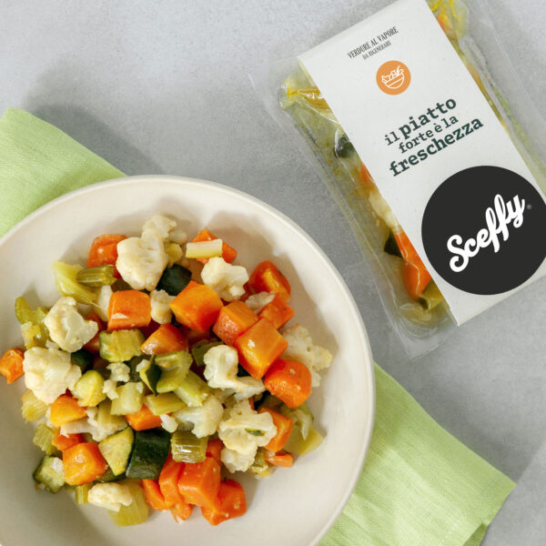 Mix di verdure al vapore: zucchine, carote, sedano verde, cavolfiore, olio extra vergine di oliva, sale marino iodato.